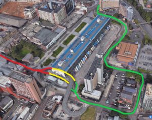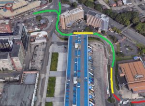 Allowed to enter bus station from Lords Walk, follow markings on road for A or B lane