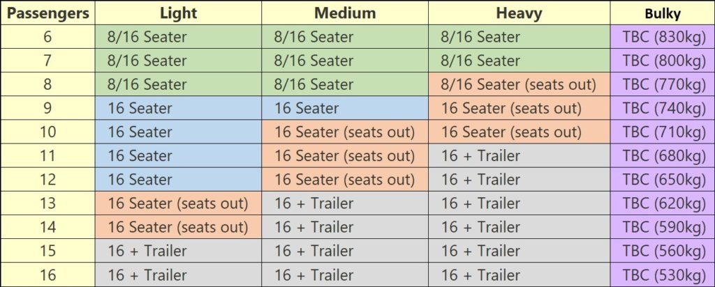 The following table shows a summary of the vehicle required for each luggage configuration;